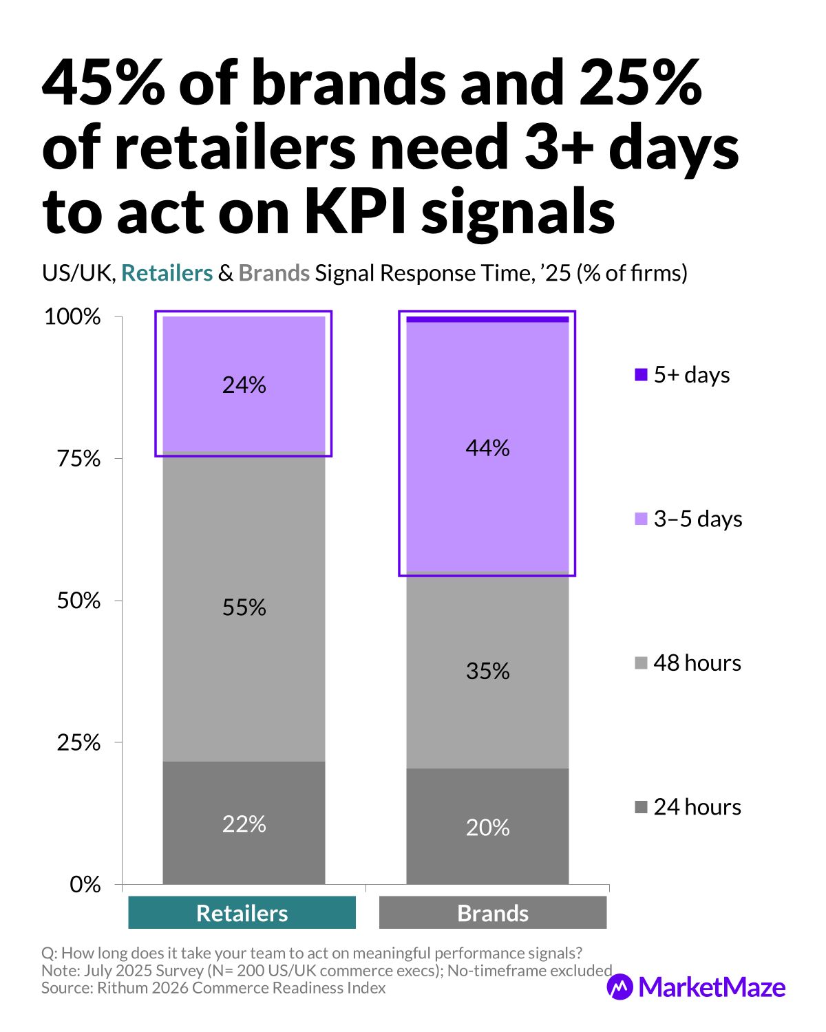 Performance signals are flashing faster than teams can respond. A quarter of retailers (25%) and nearly half of brands (45%) need three or more days to act on key metrics. Retailers fare better, with 77% responding within 48 hours, but even that pace leaves money on the table in a market that rewards instant action.