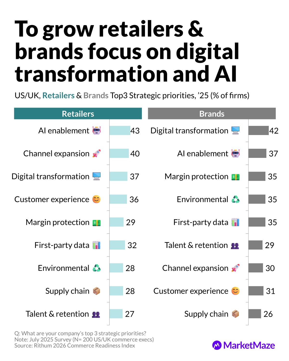 The road to growth starts with AI and digital transformation, but execution remains painfully analog. The 2026 Commerce Readiness Index shows that while AI enablement (43%) and channel expansion (40%) top retailer priorities, brands lean on digital transformation (42%) and margin protection (35%). Everyone’s investing in smarter infrastructure—yet most are still stuck doing dumb work.