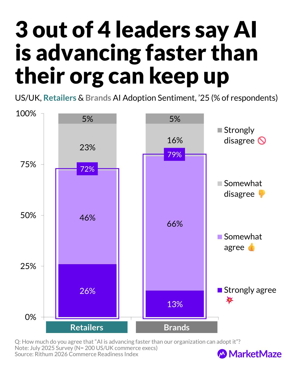 Three in four executives admit AI is advancing faster than their organizations can adapt: 72% of retailers and 79% of brands feel behind. The fear isn’t losing to competitors; it’s losing to the pace of progress itself.