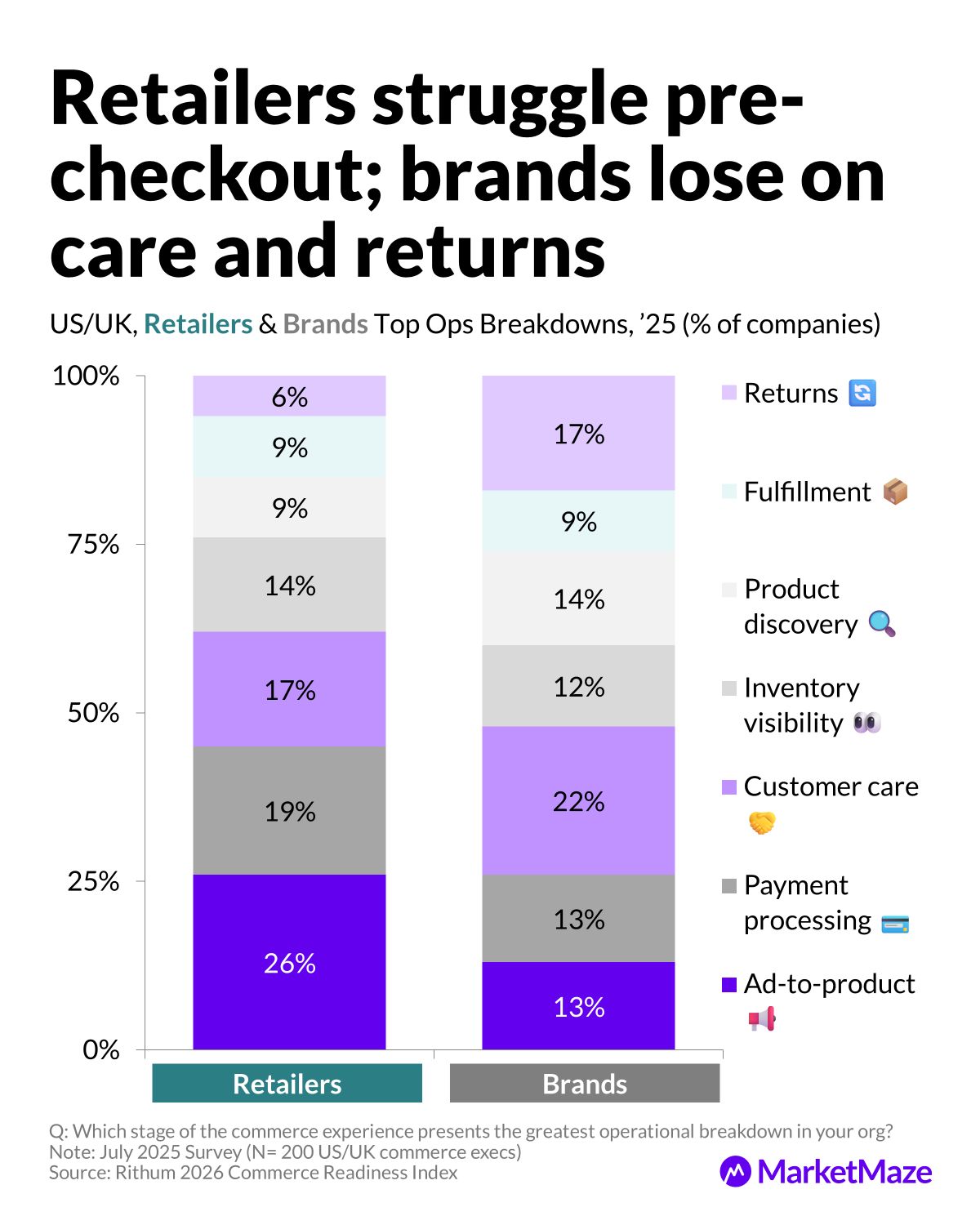 Retailers struggle before conversion: 26% report ad-to-product breakdowns and 19% payment bottlenecks. Brands bleed post-sale: 22% cite customer care issues and 17% suffer from return management. Each broken step chips away at trust and drives shoppers elsewhere. Loyalty doesn’t die in marketing; it dies in operations.