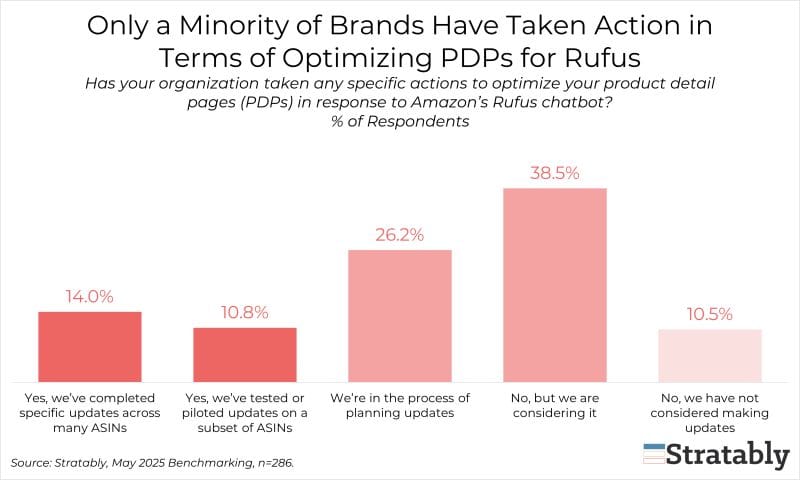 Only 14% of brands have fully updated their product detail pages (PDPs) for AI-driven discovery, according to Stratably. Another 26% are planning changes, but nearly half are either just considering it or ignoring it. This gives early movers a big edge in AI-powered retail search. Brands that lag risk getting left behind as shopping goes conversational. 👉 LinkedIn
