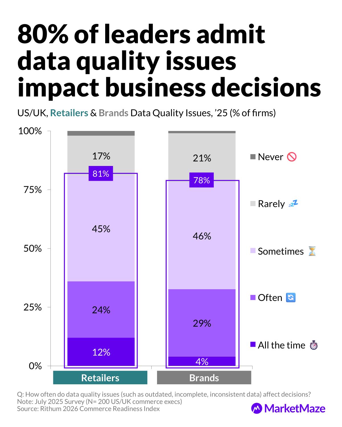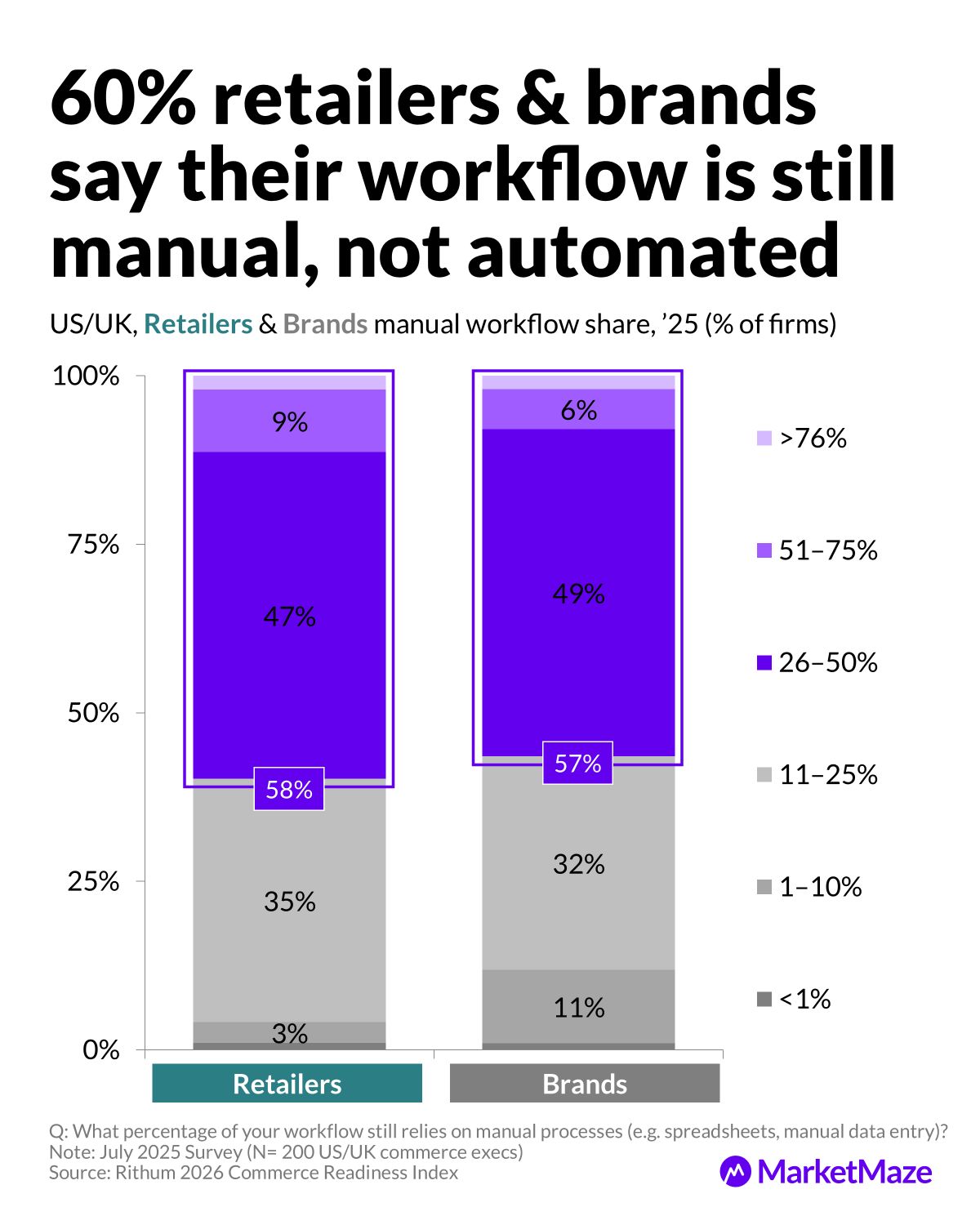 Manual execution remains the silent growth killer. Almost half of retailers (47%) and brands (49%) still rely on manual workflows for 26–50% of tasks. Automation is no longer a technical problem… it’s a leadership one. Every day lost to spreadsheets is a day competitors move faster.