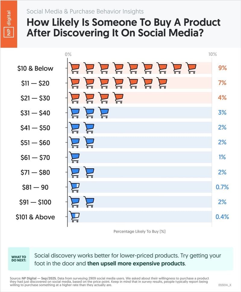 NP Digital found that 9% of social media users would buy products under $10 they see online, but willingness plummets to just 0.4% for items over $100. Price is the main barrier… interest fades fast as cost rises. Social is best for cheap impulse buys, not big-ticket conversions. Brands should use low prices to hook buyers, then upsell after the first sale. 👉 LinkedIn