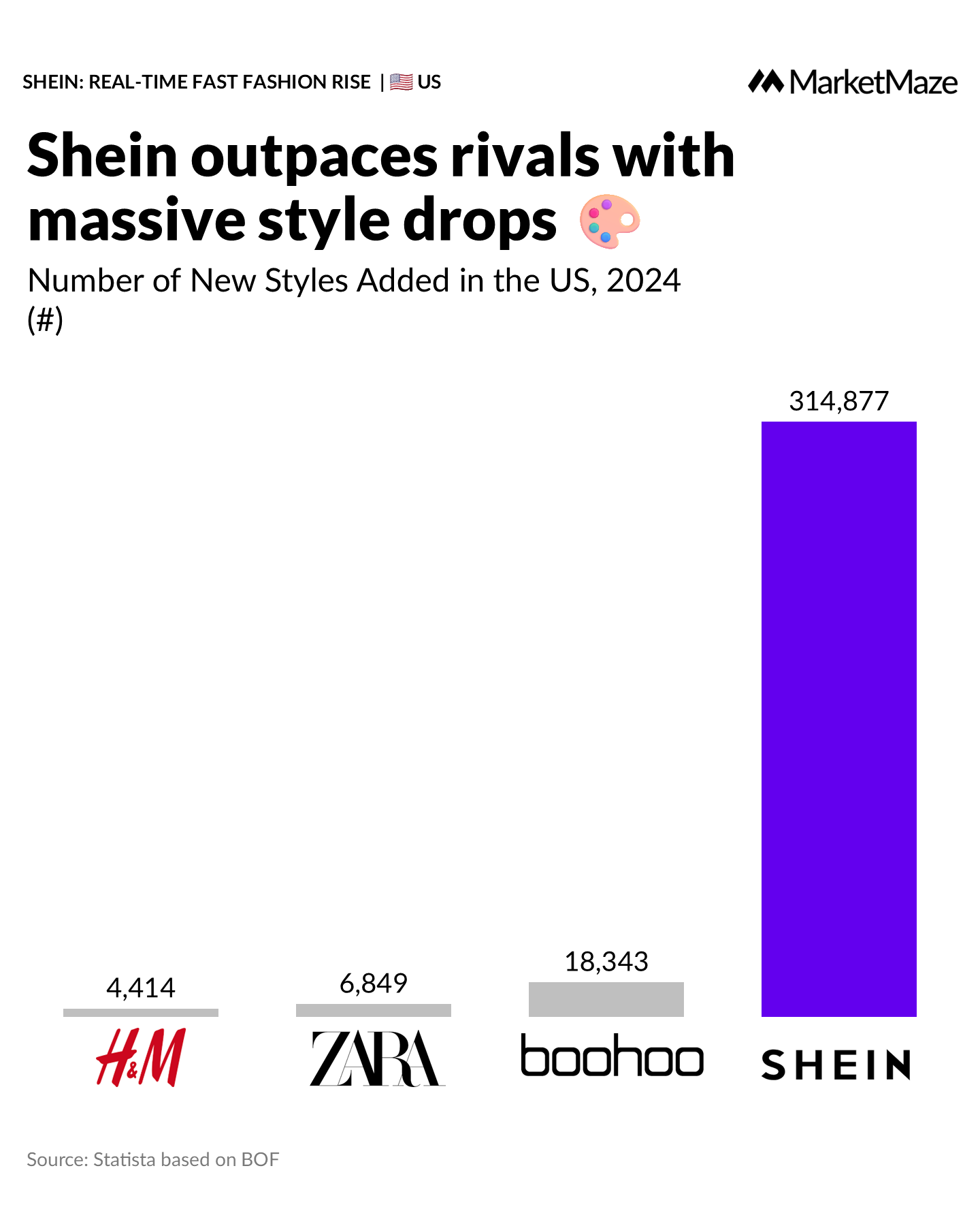 Shein outshines Zara and H&M with over 314K U.S. styles in 2024. Leveraging real-time data and rapid production, Shein revolutionizes fashion e-commerce globally.