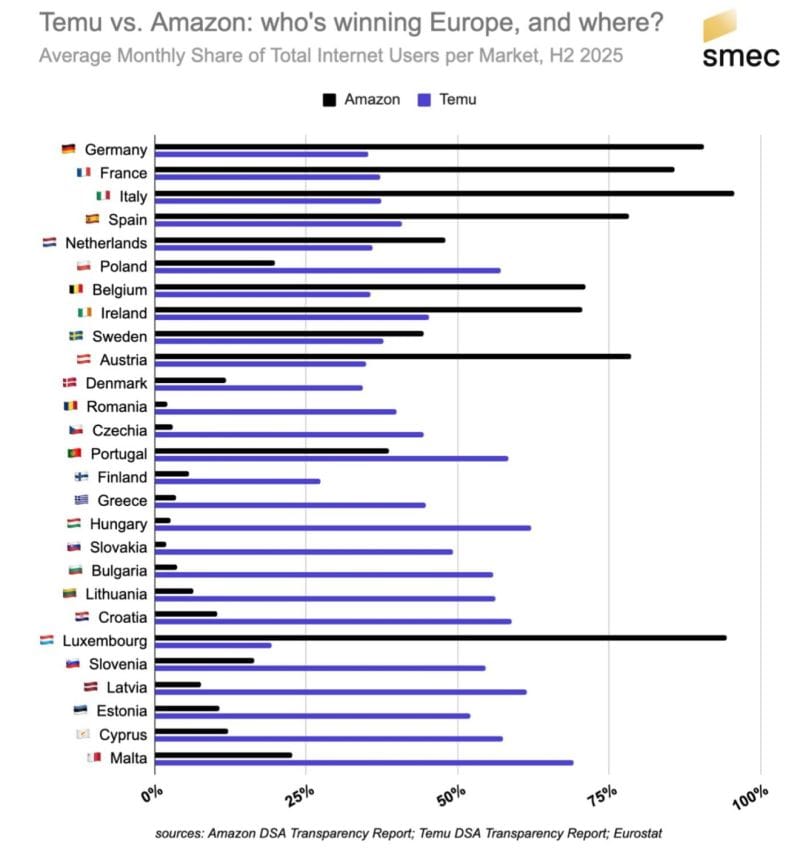 The Maze: Temu is winning reach in more countries than expected. Amazon dominates the richest markets, but Temu spreads faster across price-sensitive regions. Europe is splitting in two.