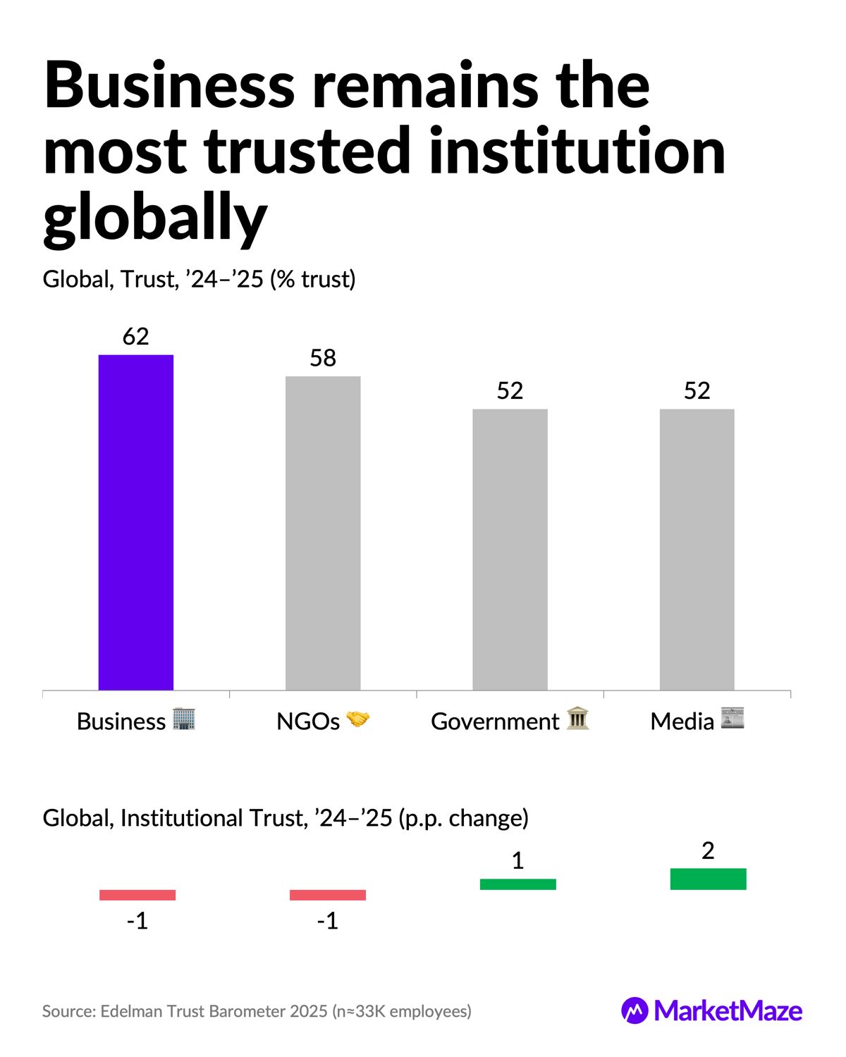 Business remains the most trusted institution at 62%, but trust fell in most countries and business is trusted in only 15 of 28 markets.