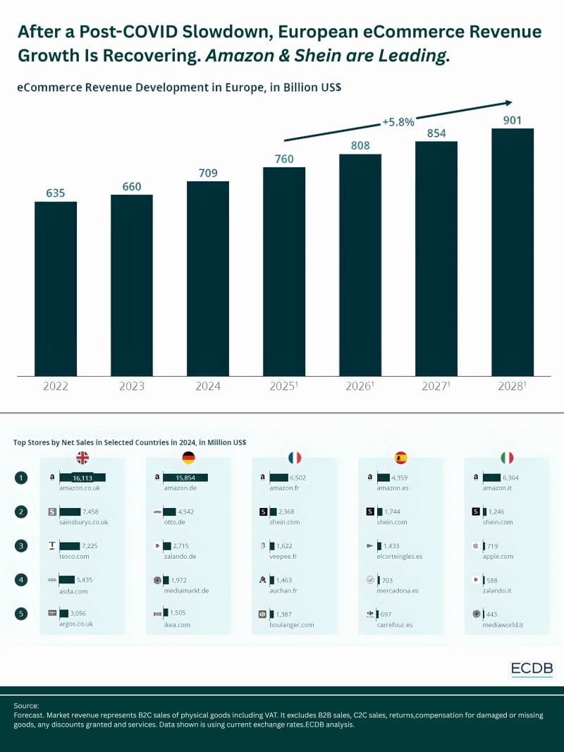 The Maze: Europe’s ecommerce engine is back online. After two soft years, online retail crossed $700B in 2024 and is now on track to hit $901B by 2028, with a sharp rebound expected in 2025. Growth is slower than the US or Asia, but scale and concentration are rising fast, and Amazon is tightening its grip across every major market.