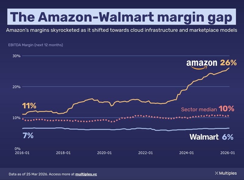 Amazon EBITDA margins moved from ~11% in 2016 to ~26% in 2026, while Walmart stayed flat at ~6 to 7%, with sector median around 10.7%.