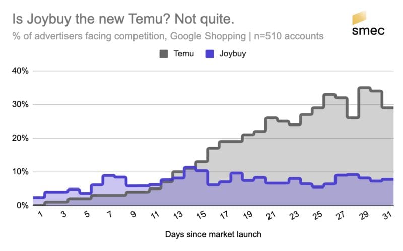 In Mar 2026, >10% of advertisers already faced Joybuy in Google Shopping, with early auction losses near 80% but improving to <50% within weeks as performance sharpened.