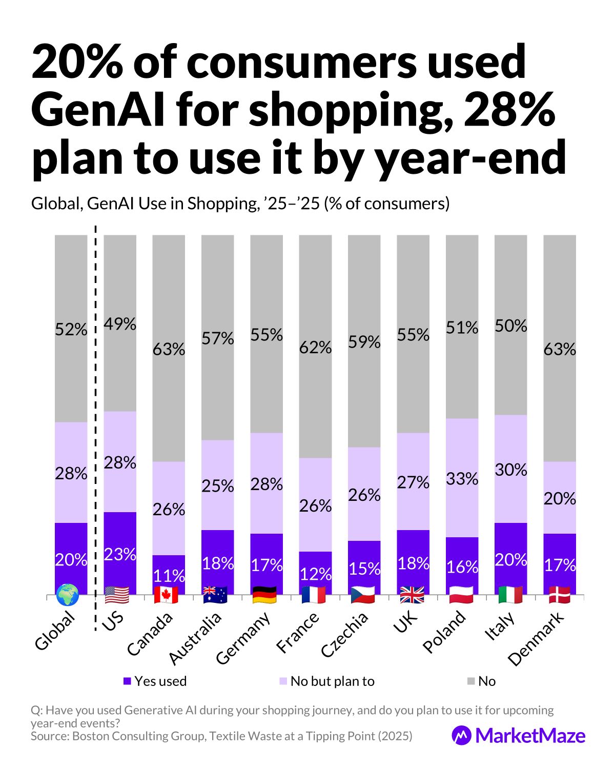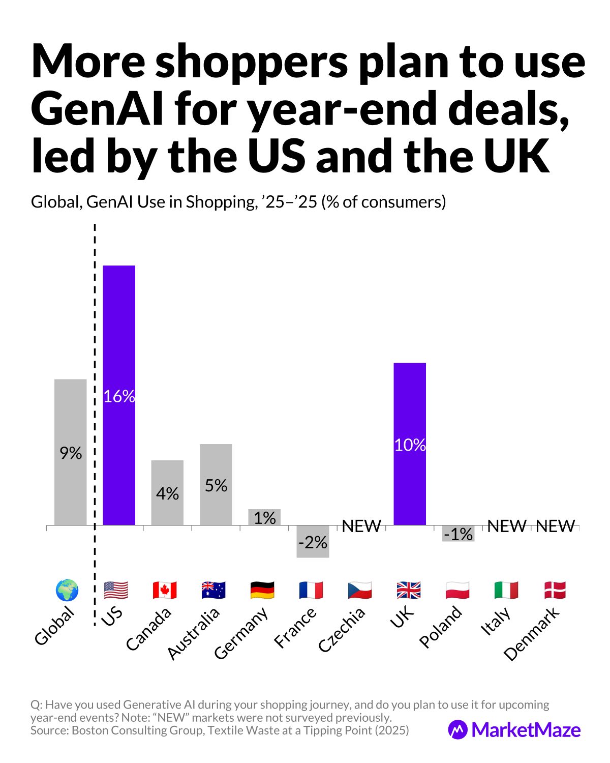 GenAI becomes a mainstream shopping assistant. Adoption accelerates rapidly, especially in the US and UK, where shoppers rely on AI to compare products, find deals and reduce decision fatigue.