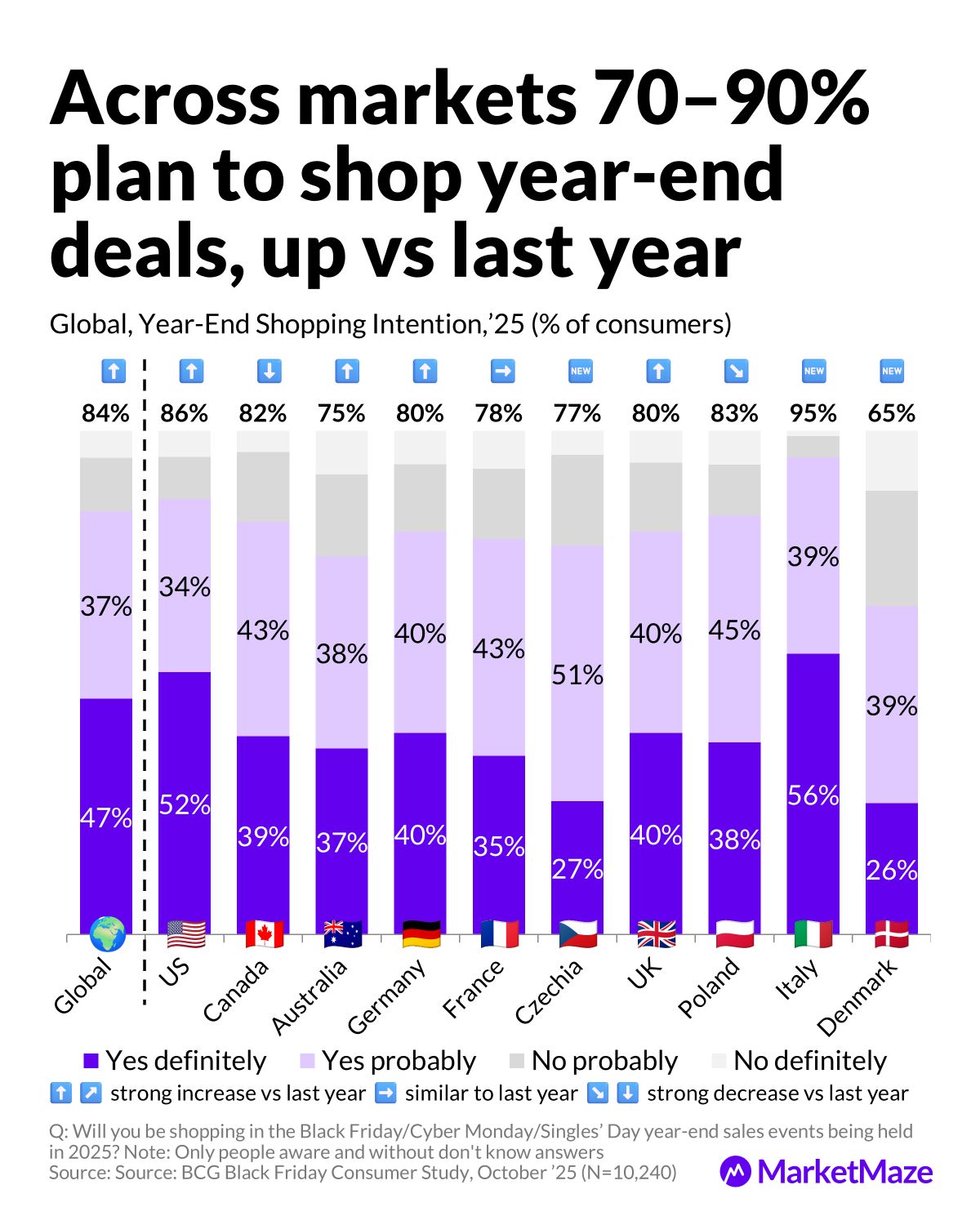 Across markets, 70–90% plan to shop year-end deals, led by Italy 95% and the US 86%; intent rises even as cautious sentiment persists.