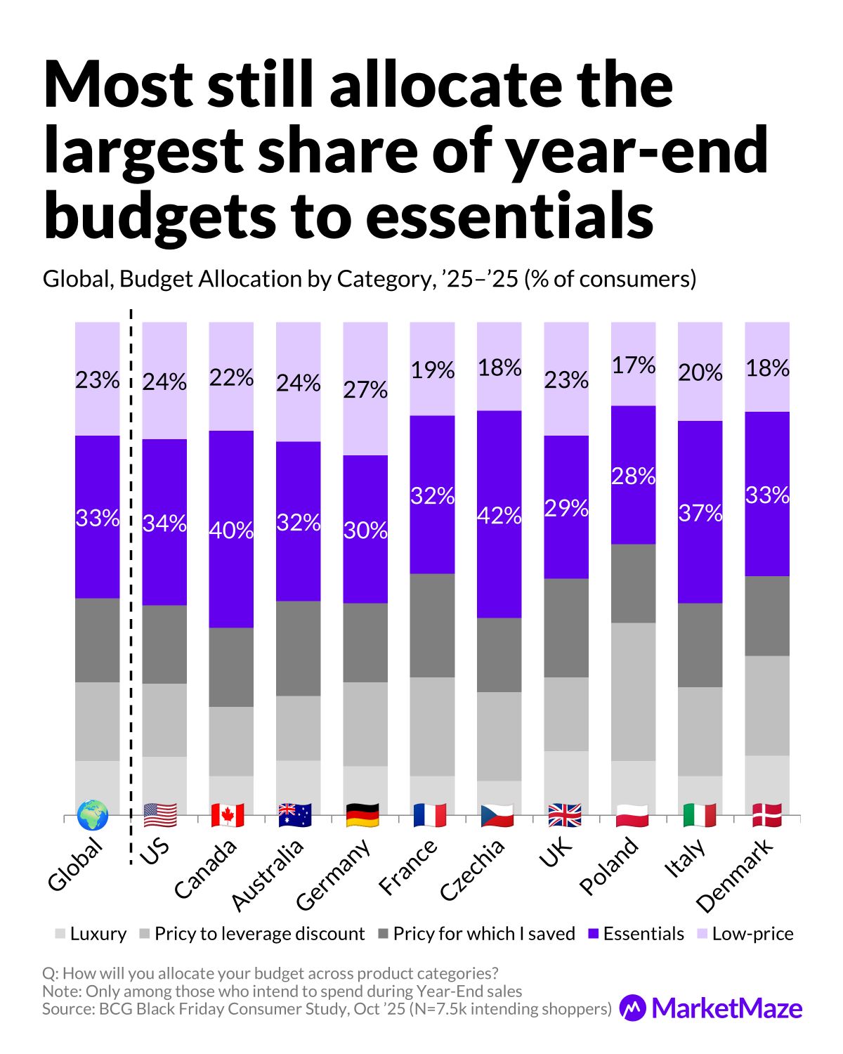 Consumers still allocate most year-end budgets to essentials, yet discretionary spending returns as confidence improves. Essentials hold the top share, but pricier categories gain ground as shoppers look for meaningful deals.